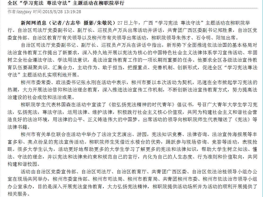 柳州教育局网站发布全区“学习宪法 尊法守法”主题活动在我院举行的信息 来源:柳州职业技术学院新闻网 作者:崔智慧 编审: 发布时间:2015-07-08 浏览次数: 次 【字体:小 大】 分享到: 6月2日,柳州教育局网站发布全区“学习宪法 尊法守法”主题活动在我院举行的信息。(崔智慧) 关闭 打印正文