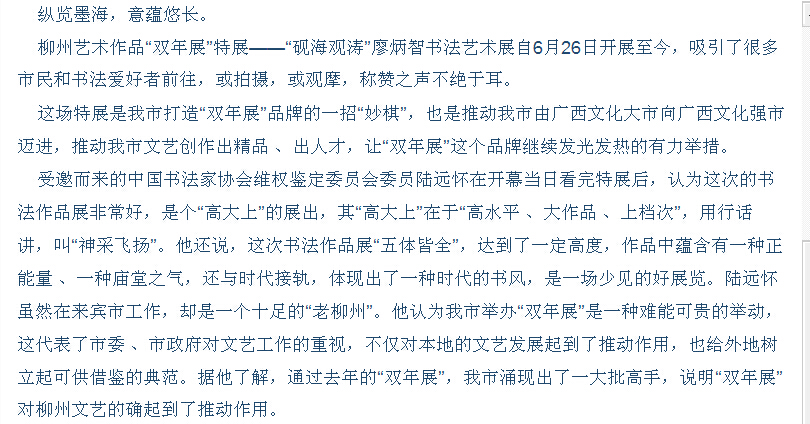 柳州日报刊发我院师生参加柳州市书法艺术展的新闻 来源:柳州职业技术学院新闻网 作者:石玉丹 编审: 发布时间:2015-07-13 浏览次数: 次 【字体:小 大】 分享到: 2015年7月6日,柳州日报在第10版以“扬书法之美引文化热潮”为题,刊发我院师生参加柳州市书法艺术展的新闻。(截图:石玉丹) 关闭 打印正文