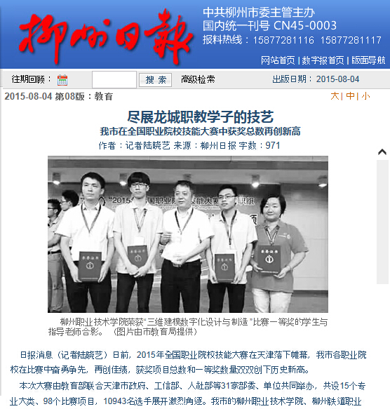 柳州日报近日刊发我院师生在全国职业技能大赛中获奖的新闻 来源:柳州职业技术学院新闻网 作者:石玉丹 编审: 发布时间:2015-08-04 浏览次数: 次 【字体:小 大】 分享到: 2015年8月4日,柳州日报在第8版以“尽展龙城职教学子的技艺”为题,刊发我院师生在全国职业技能大赛中获奖的新闻。(截图:石玉丹) 关闭 打印正文