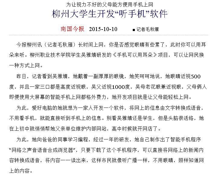 南国今报近日刊发我院大学生开展软件开发的新闻 来源:柳州职业技术学院新闻网 作者:石玉丹 编审: 发布时间:2015-10-13 浏览次数: 次 【字体:小 大】 分享到: 2015年10月10日,南国今报在第6版以“柳州大学生开发‘听手机’软件”刊发我院大学生吴雅婧开展软件开发的新闻。(截图:石玉丹) 关闭 打印正文