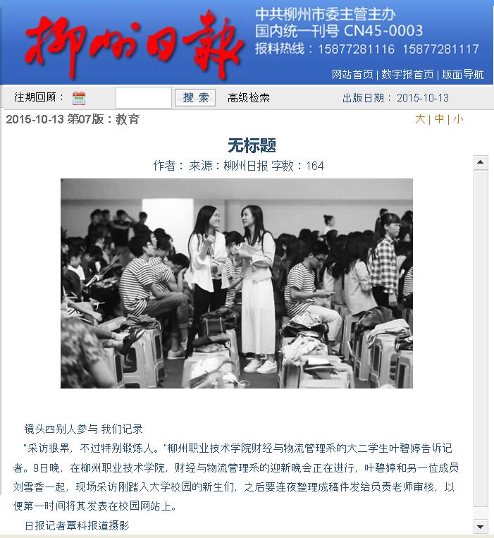 柳州日报近日刊发我院学生记者在校园开展采访活动的新闻 来源:柳州职业技术学院新闻网 作者:石玉丹 编审: 发布时间:2015-10-19 浏览次数: 次 【字体:小 大】 分享到: 2015年10月13日,柳州日报在第7版,以“因为热爱而执着”为题,刊发我院学生记者在校园开展采访活动的新闻。(截图:石玉丹) 关闭 打印正文