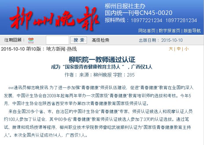 2015年10月10日,柳州晚报在第10版,以“柳职院一教师通过认证”为题,刊发我院教师曾昭武被认证为“国家级青春健康教育主持人”的新闻。(截图:石玉丹)