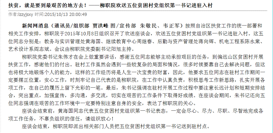 柳州教育局网站发布我院欢送五位贫困村党组织第一书记进驻入村的信息 来源:柳州职业技术学院新闻网 作者:崔智慧 编审: 发布时间:2015-11-30 浏览次数: 次 【字体:小 大】 分享到: 10月16日,柳州教育局网站发布我院欢送五位贫困村党组织第一书记进驻入村的信息。(崔智慧) 关闭 打印正文