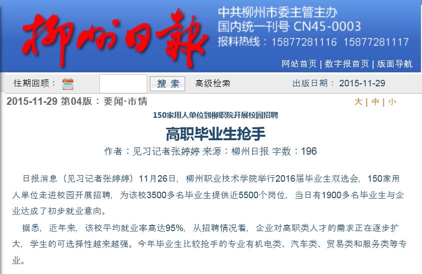 柳州日报刊发我院举办双选会的新闻 来源:柳州职业技术学院新闻网 作者:石玉丹 编审: 发布时间:2015-12-01 浏览次数: 次 【字体:小 大】 分享到: 2015年11月29日,柳州日报在第4版,以“高职毕业生抢手”为题,刊发我院举办双选会的新闻。(截图:石玉丹) 关闭 打印正文