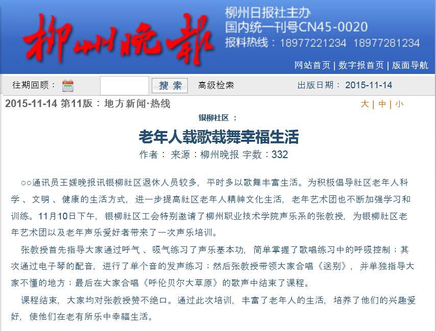 柳州晚报刊发我院教师给老年人做声乐知识培训的新闻 来源:柳州职业技术学院新闻网 作者:石玉丹 编审: 发布时间:2015-12-01 浏览次数: 次 【字体:小 大】 分享到: 2015年11月14日,柳州晚报在第11版,以“老年人载歌载舞幸福生活”为题,刊发我院教师给老年人做声乐知识培训的新闻。(截图:石玉丹) 关闭 打印正文