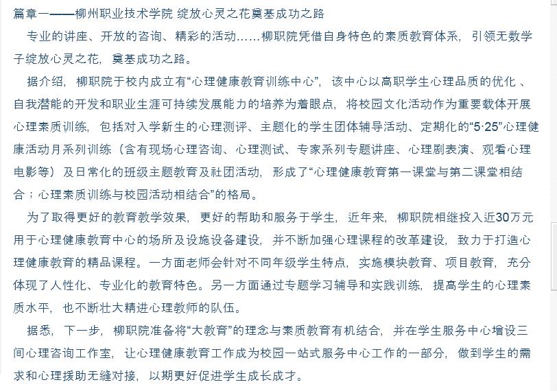 柳州晚报刊发我院以心理健康教育服务学生成长成才的新闻 来源:柳州职业技术学院新闻网 作者:石玉丹 编审: 发布时间:2015-12-01 浏览次数: 次 【字体:小 大】 分享到: 2015年11月23日,柳州晚报在第26版,以“放飞心灵 绽放美丽”为题,刊发我院以心理健康教育服务学生成长成才的新闻。(截图:石玉丹) 关闭 打印正文