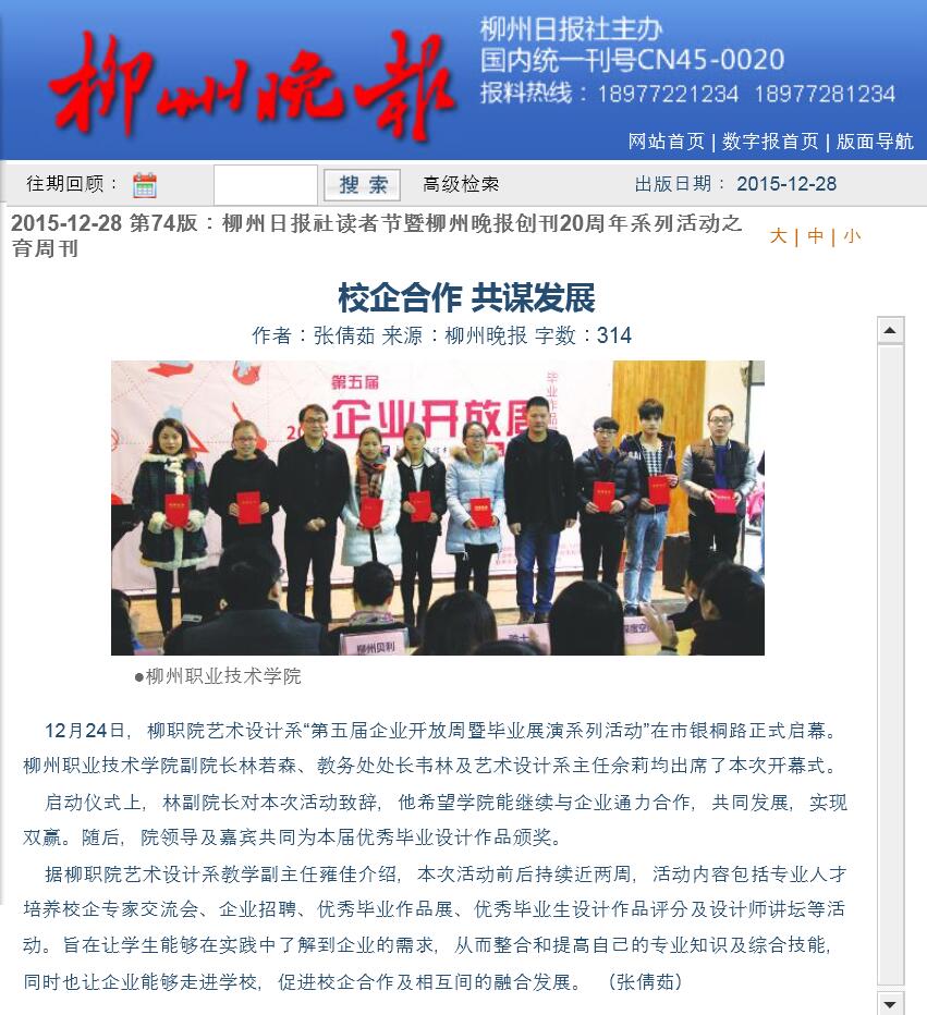 2015年12月28日,柳州晚报在第74版,以“校企合作,共谋发展”为题,刊发我院艺术设计系举办第五届企业开放周暨毕业展演系列活动的新闻。(截图:石玉丹)