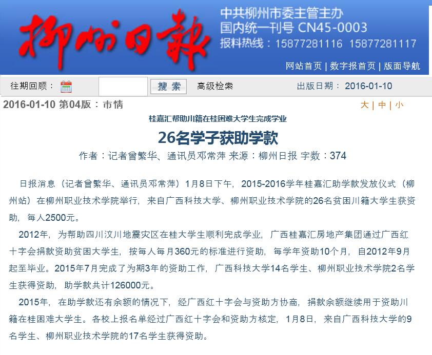 柳州日报刊发我院学生获社会捐助的新闻 来源:柳州职业技术学院新闻网 作者:石玉丹 编审: 发布时间:2016-01-13 浏览次数: 次 【字体:小 大】 分享到: 2016年1月10日,柳州日报在第4版,以“26名学子获助学款”为题,刊发我院学生获社会捐助的新闻。(截图:石玉丹) 关闭 打印正文