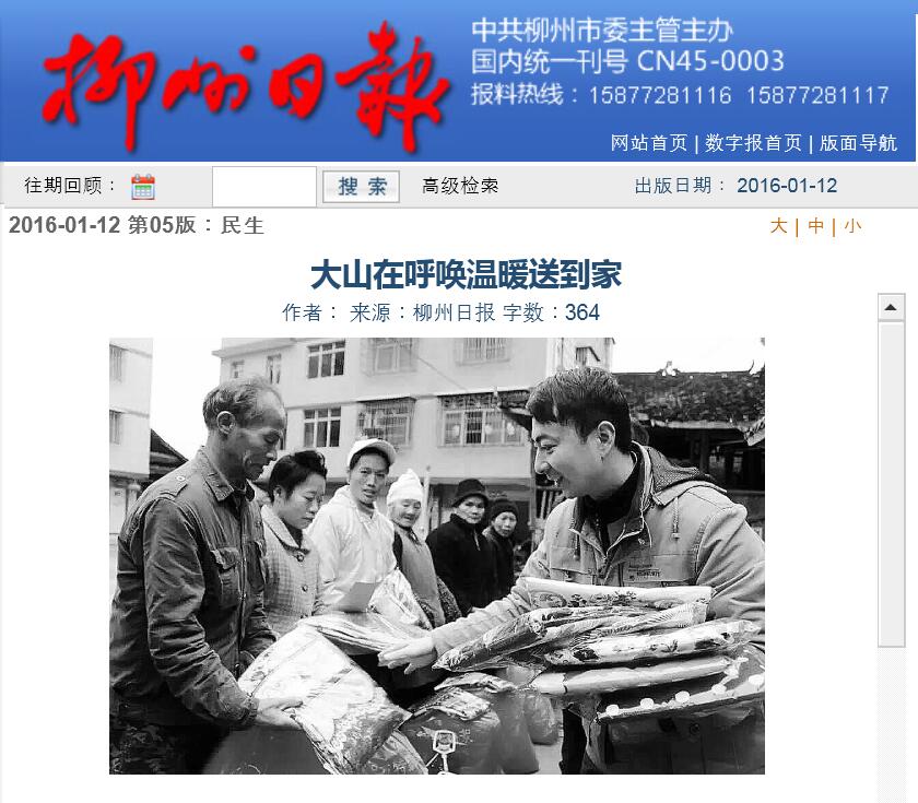 柳州日报刊发我院老师向三江农村捐款捐物的新闻 来源:柳州职业技术学院新闻网 作者:石玉丹 编审: 发布时间:2016-01-13 浏览次数: 次 【字体:小 大】 分享到: 2016年1月12日,柳州日报以“大山在呼唤 温暖送到家”为题,刊发我院老师向三江农村捐款捐物的新闻。(截图:石玉丹) 关闭 打印正文