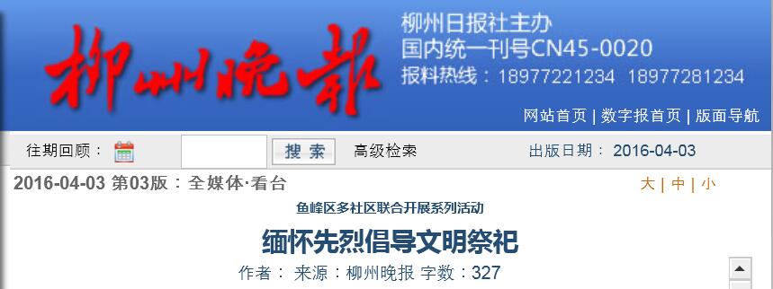 柳州晚报刊发我院大学生祭祀先烈的新闻 来源:柳州职业技术学院新闻网 作者:石玉丹 编审: 发布时间:2016-04-14 浏览次数: 次 【字体:小 大】 分享到: 2016年4月3日,柳州晚报在第3版,以“缅怀先烈 倡导文明祭祀”为题,刊发我院大学生清明时节到烈士陵园祭祀先烈的新闻。(截图:石玉丹) 关闭 打印正文