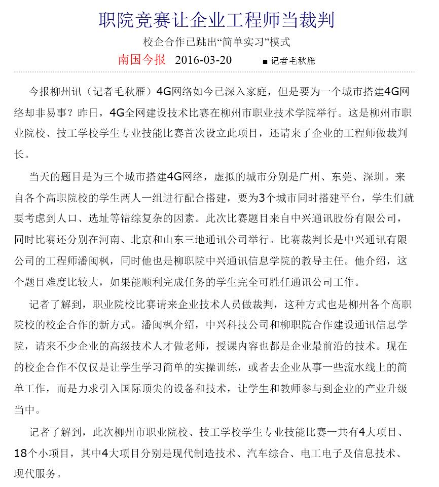 2016年3月20日,南国今报在第2版,以“职院竞赛让企业工程师当裁判”为题,刊发我院承办2016柳州市职业院校(高职组)技能竞赛4个赛项的新闻。(截图:石玉丹)