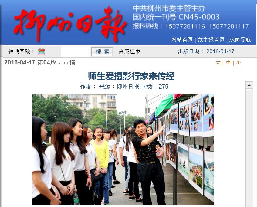 柳州日报刊发“新闻摄影与摄影艺术”公益讲座走进我院的新闻 来源:柳州职业技术学院新闻网 作者:石玉丹 编审: 发布时间:2016-04-20 浏览次数: 次 【字体:小 大】 分享到: 2016年4月17日,柳州日报在第4版、以“师生爱摄影 行家来传经”为题,刊发新闻摄影与摄影艺术”公益讲座走进我院的新闻。(截图:石玉丹) 关闭 打印正文