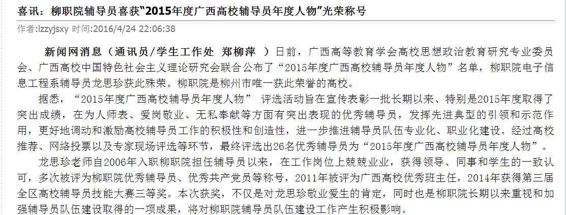 柳州教育局网站发布我院辅导员喜获“2015年度广西高校辅导员年度人物”光荣称号的信息 来源:柳州职业技术学院新闻网 作者:崔智慧 编审: 发布时间:2016-04-27 浏览次数: 次 【字体:小 大】 分享到: 2016年4月24日,柳州教育局网站发布我院辅导员喜获“2015年度广西高校辅导员年度人物”光荣称号的信息。(截图 崔智慧) 关闭 打印正文