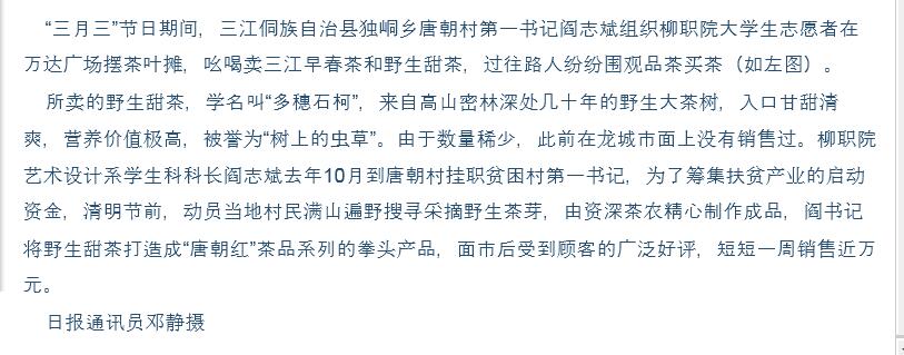 柳州日报刊发我院教师为贫困村茶叶找销路的新闻 来源:柳州职业技术学院新闻网 作者:石玉丹 编审: 发布时间:2016-05-10 浏览次数: 次 【字体:小 大】 分享到: 2016年4月13日,柳州日报在第8版,以“帮贫困村吆喝卖茶”为题,刊发我院教师为贫困村的茶叶找销路的新闻。(截图:石玉丹) 关闭 打印正文