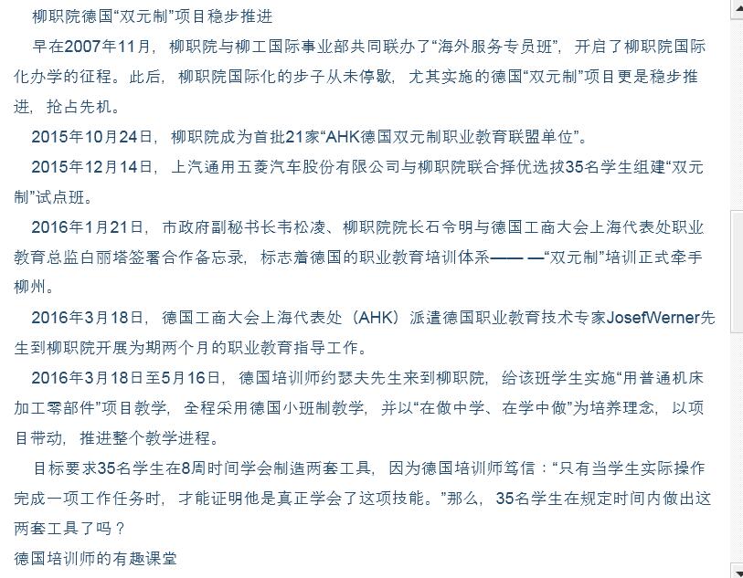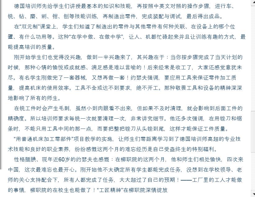 2016年5月20日,柳州日报在第2版,以“‘大国工匠’初长成”为题,刊发德国培训师约瑟夫到我院给“双元制”试点班35名学生实施两个月《用普通机床加工零部件》课程的专题新闻。(截图:石玉丹)