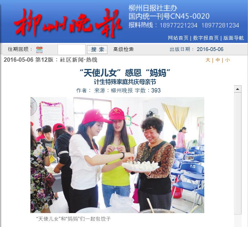 2016年5月6日,柳州晚报在第12版,以“‘天使儿女’感恩‘妈妈’”为题,刊发我院大学生志愿者到社区与计生特殊家庭过母亲节的新闻。(截图:石玉丹)