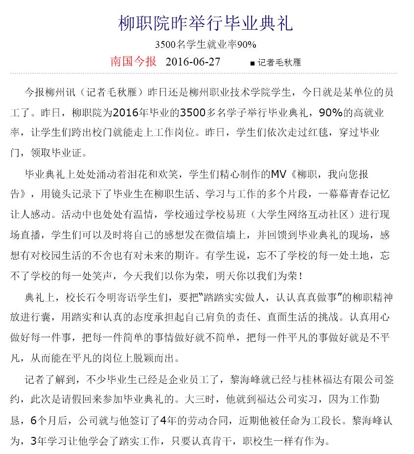 南国今报刊发我校举行毕业典礼的新闻 来源:柳州职业技术学院新闻网 作者:石玉丹 编审: 发布时间:2016-06-28 浏览次数: 次 【字体:小 大】 分享到: 2016年6月27日,南国今报在第3版,以“柳职院昨举行毕业典礼”为题,刊发我校为3514名2016届毕业生举行毕业典礼的新闻。(截图:石玉丹) 关闭 打印正文