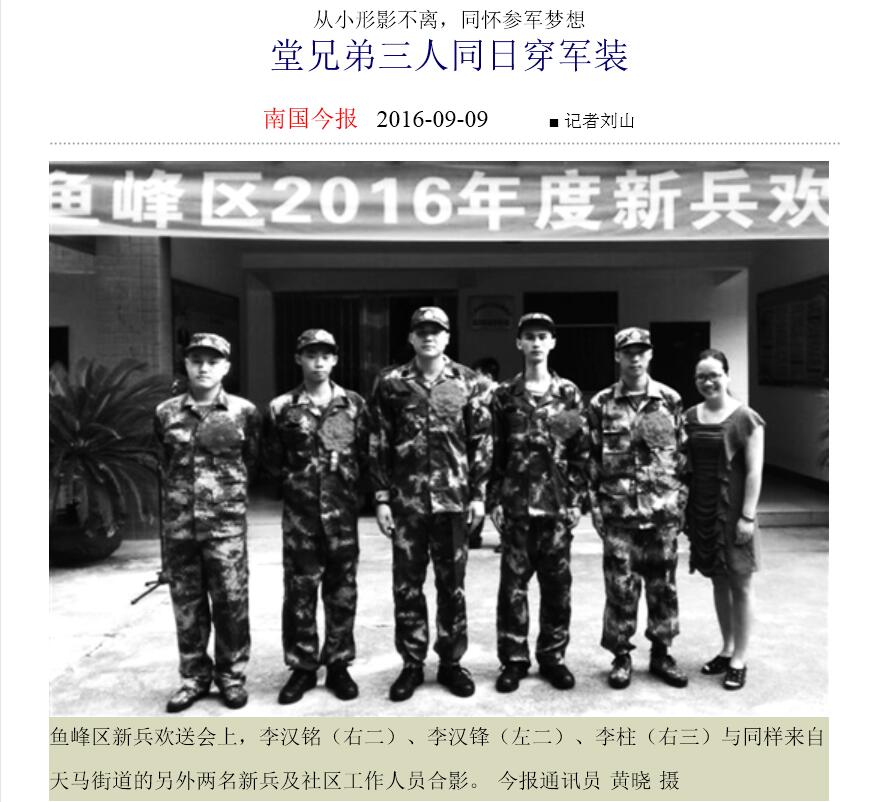 南国今报刊发我校毕业生参军的通讯 来源:柳州职业技术学院新闻网 作者:石玉丹 编审: 发布时间:2016-09-20 浏览次数: 次 【字体:小 大】 分享到: 2016年9月9日,南国今报在第11版,以“堂兄弟三人同日穿军装”为题,刊发我校毕业生参军的通讯。(截图:石玉丹) 关闭 打印正文