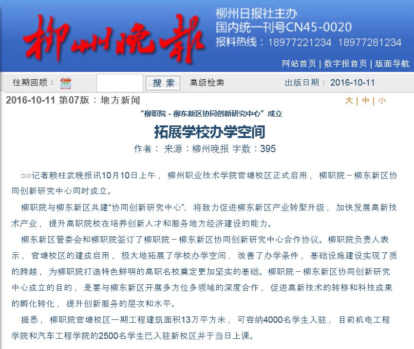 柳州晚报刊发我校官塘校区启用的新闻 来源:柳州职业技术学院新闻网 作者:石玉丹 编审: 发布时间:2016-10-11 浏览次数: 次 【字体:小 大】 分享到: 2016年10月11日,柳州晚报在第7版,以“拓展学校办学空间”为题,刊发我校官塘校区启用的新闻。(截图:石玉丹) 关闭 打印正文