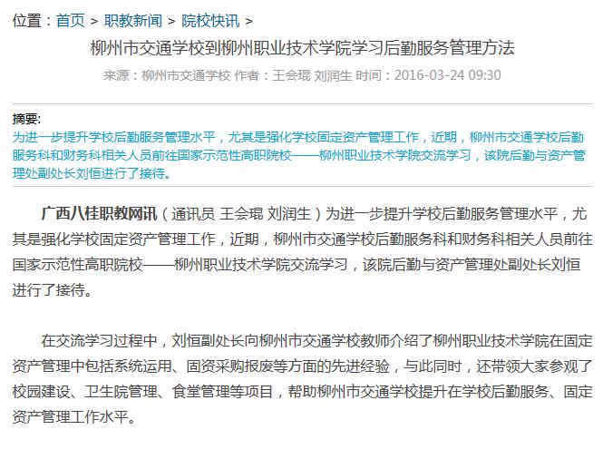 2016年3月24日,八桂职教网在“院校快讯”栏目,刊发我校向柳州市交通学校传授后勤服务管理办法的新闻。详情点击:http://www.ep12.com/a/zhijiaoxinwen/kuaixun/2016/0324/39794.html (截图:石玉丹)