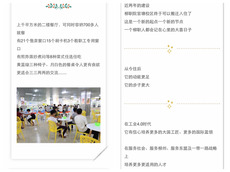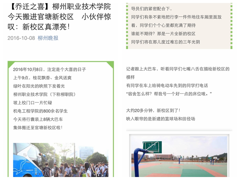 2016年10月8日,柳州晚报官方微信公众号以“【乔迁之喜】柳州职业技术学院今天搬进官塘新校区 小伙伴惊叹:新校区真漂亮! ”为题,发布我?;绻こ萄г喊崆ㄐ滦G男挛拧#ń赝迹禾蒲蓿?/font>
