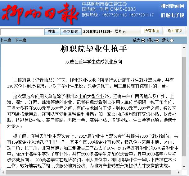 2016年11月25日,柳州日报在第三版,以“柳职院毕业生抢手”为题,刊发我校举行的2017级毕业生就业双选会的新闻。详情可点击http://szb.lznews.gov.cn/lzrb/html/2016-11/25/content_4636.htm(截图:唐艳)