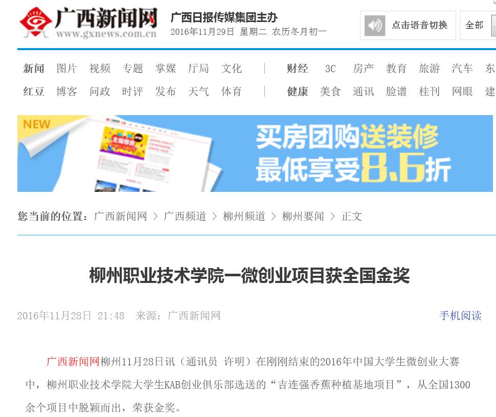 【广西新闻网】柳州职业技术学院一微创业项目获全国金奖 来源:柳州职业技术学院新闻网 作者:石玉丹 编审: 发布时间:2016-11-29 浏览次数: 次 【字体:小 大】 分享到: 2016年11月28日,广西新闻网刊发我校一微创业项目获全国金奖的新闻。(截图:石玉丹) 关闭 打印正文