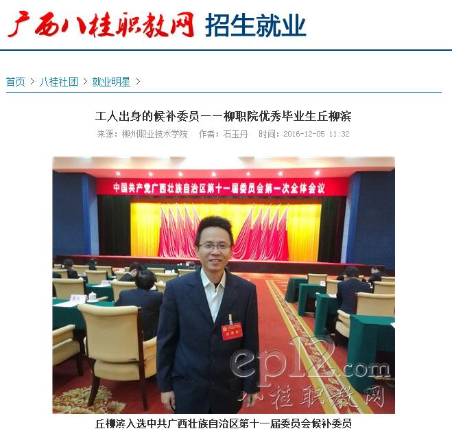 2016年12月5日,广西八桂职教网在招生就业版块的“就业明星”栏目,刊发我校优秀毕业生丘柳滨的职场发展故事。(截图:石玉丹)详情请点击:http://www.ep12.com/a/jiuyechuangye/youxiubiyesheng/2016/1205/43627.html