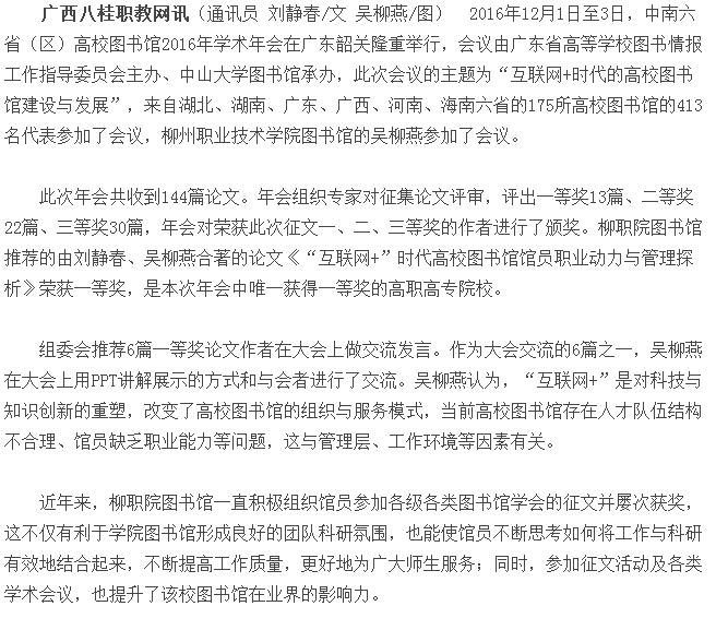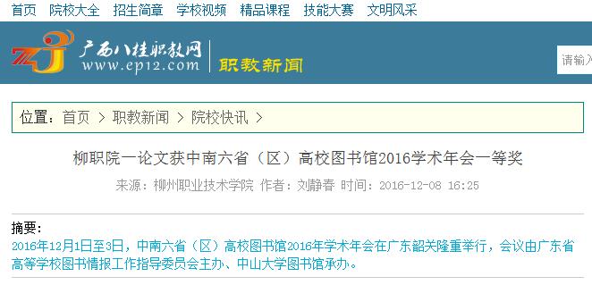 2016年12月8日,广西八桂职教网在职教新闻-院??煅独改恐?,刊发了我校一论文获中南六?。ㄇ└咝M际楣?016学术年会一等奖的新闻。(截图:石玉丹)