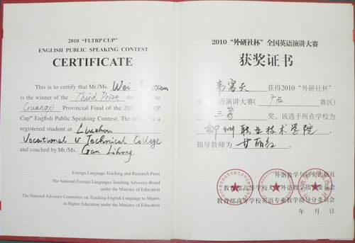 2010年11月20日至21日,2010年“外研社杯”全国英语演讲大赛广西赛区复赛在广西医科大学举行,我院选手沈志、韦富天两位同学在陈芳、甘丽红两位指导老师的带领下参加了比赛,并分别获得二、三等奖,我院获得专科组团体二等奖,创造了我院在该项赛事中的最好成绩。