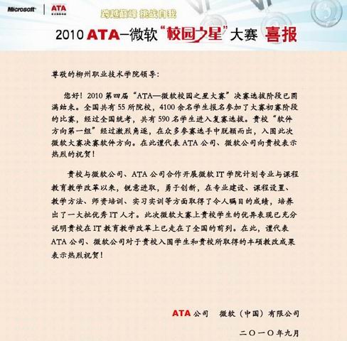 近日,我院信息工程系收到ATA公司——微软(中国)有限公司发来喜报:在刚刚结束的2010ATA第四届微软校园之星大赛选拔赛中,我院信息工程系史绍宁老师指导的、由2008级软件技术专业学生黄成林、陈庆峰、黎倩雪等三位同学组成的参赛团队经过激烈的角逐,以优异的成绩从众多参赛选手中脱颖而出,成功入围本次大赛软件方向总决赛。(文、图/廖美暖)