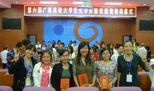2011年11月27日,广西高校大学生第六届化学实验技能竞赛落下帷幕,我院参赛选手经过两天的激烈角逐,从众多选手中脱颖而出,取得了骄人的成绩。其中钟明娟同学荣获专科组一等奖;黄芝敏同学荣获专科组二等奖;杨一芳同学荣获专科组三等奖;莫晓晴同学荣获专科组优胜奖。这是自2005年我院首次参加广西高校大学生化学实验技能竞赛以来,在该赛事中取得的最好成绩。