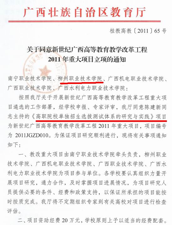 日前,广西教育厅公布《关于同意新世纪广西高等教育教学改革工程2011年重大项目立项的通知》(桂教高教〔2011〕65号),我院主持或参与的2个项目获得立项。由我院张翔副院长主持的《基于企业需求的高职校企合作理论研究与实践探索》获项目资助经费10万元,同时参与由南宁职业技术学院牵头组织的《高职院校单独招生选拔测试体系的研究与实践》项目研究。