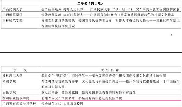 自治区教育厅、自治区高工委于2011年12月22日下发了《关于公布 2011 年广西高校校园文化建设优秀成果评选结果的通知》(桂党高工宣〔2011〕103 号),我院申报的《创建“四大”文化名片 彰显具有高职特色的校园文化》建设成果荣获优秀成果二等奖。全区各高校共有27项校园文化成果被授予“2011年广西高校校园文化建设优秀成果”荣誉称号。