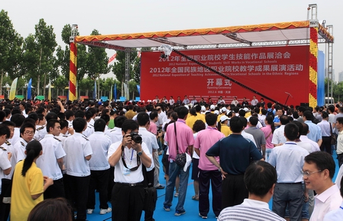 6月27日至29日,2012年全国职业院校学生技能作品展洽会在天津海河教育园区隆重举行。展洽会由教育部职业教育与成人教育司主办,天津市教委承办,各?。ㄇ?、市)教育厅(教委)、各计划单列市教育局、新疆生产建设兵团教育局、有关部门和行业组织协办,以“展示职成教成果,喜迎十八大召开”为主题,共有29个省(市、区)和计划单列市参展?! ?br> 教育部鲁昕副部长出席开幕式并讲话。她指出,在党中央、国务院的正确领导下,全国职业院校技能大赛年年跃上新台阶,有效助推了全国职业教育的整体发展。天津市副市长张俊芳在开幕式上致辞,广西壮族自治区副主席李康、教育部各有关部门负责人、天津市教委主任靳润成、南开大学副校长佟家栋等出席了开幕式。