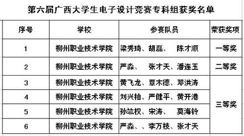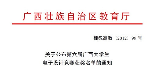 近日,广西壮族自治区教育厅公布了第六届广西大学生电子设计竞赛获奖名单(桂教高教【2012】99号),我院参赛队6件作品分别获第六届广西大学生电子设计竞赛专科组一等奖1项,二等奖1项,三等奖4项(具体获奖名单详见附件)。