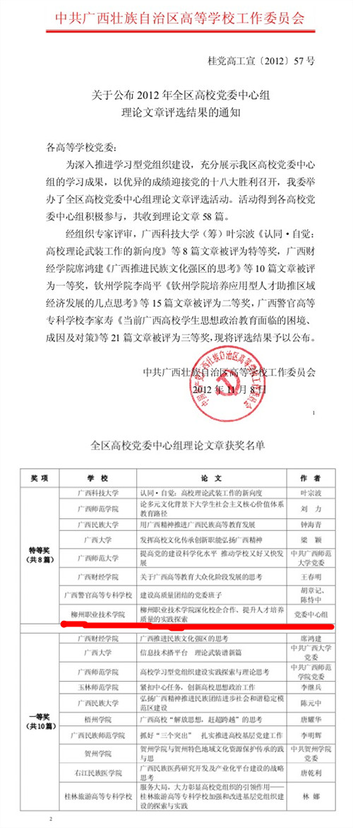 日前,自治区高工委下发了《关于公布 2012 年全区高校党委中心组 理论文章评选结果的通知》(桂党高工〔 2012 〕 57 号)的表彰文件,表彰了54篇2012年全区高校党委中心组获奖理论文章。由党委宣传部执笔撰写的我院党委中心组理论学习文章《柳州职业技术学院深化校企合作、提升人才培养质量的实践探索》被评为特等奖。在此次评比活动中获特等奖的仅有 8 篇,我院是全区唯一获此殊荣的高职院校。