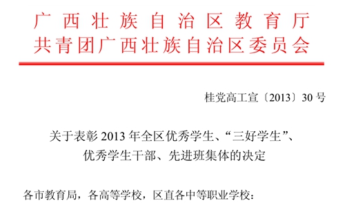 为培育学生先进典型,在全院学生中树立学习榜样,激励学生学习先进、崇尚先进、争当先进,我院推选若干学子参评2013年全区“三好学生”、“优秀学生干部”、“先进班集体”、“优秀毕业生”。近日,自治区教育厅先后下文(桂教﹝2013﹞2号、桂党高工宣﹝2013﹞30号),我院11名学生被评为全区“三好学生”、6名学生被评为全区“优秀学生干部”、4个班集体被评为全区“先进班集体”,30名学生喜获“2013年度广西壮族自治区普通高等教育优秀大学毕业生”称号,获得表彰的人数名列柳州高职院校之首。