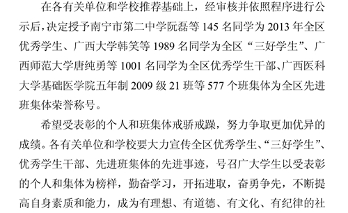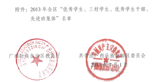 全区“三好学生”:劳传华、马彬华、唐乾宗、张腾、杨军忠、陈才顺、黄柳生、梁庆明、邓林秀、杨枫婷、辛凤娱;