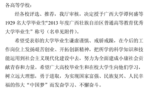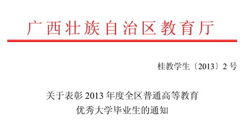 “2013年度广西壮族自治区普通高等教育优秀大学毕业生”:陈湘富、黄琼、袁春演、陈宇明、唐乾宗、劳传华、张力友、陈虹妃、郭泽锋、温捷媚、陈睿、陈晓辉、黄古技、周世亮、罗福、张森、覃思顺、钟世富、董亚辉、陆佳慧、李明秀、黄海龙、江梅珍、李莉、陆青玲、陶柳通、樊刘娜、韦福雄、邓泳、罗倩。