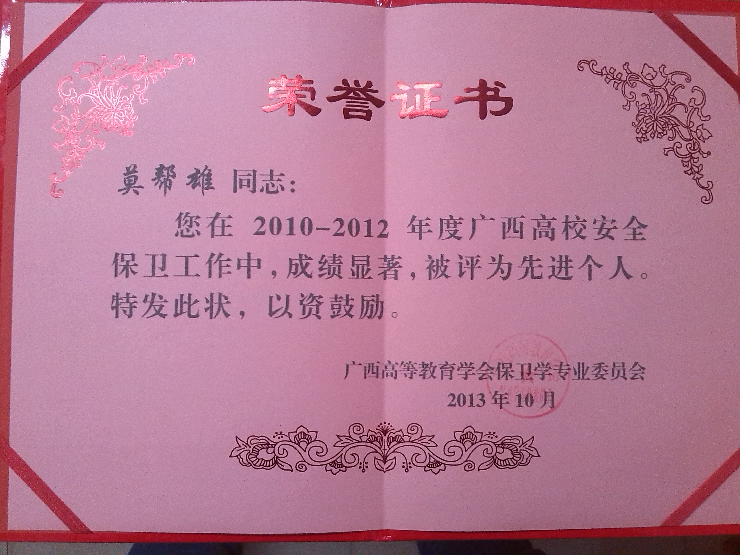 “2010-2012广西高校安全保卫工作先进个人”荣誉证书