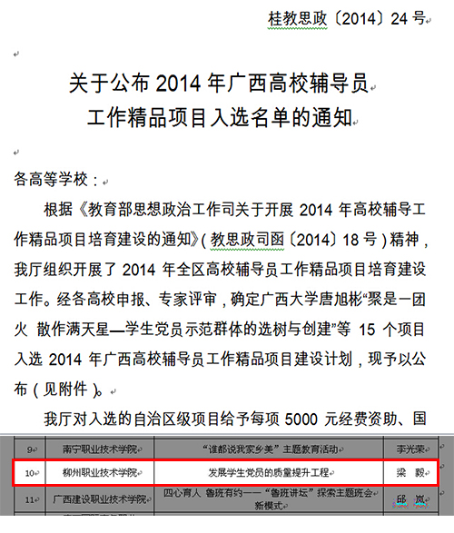 艺术设计系获得“2014年广西高校辅导员工作精品项目”奖文件截图
