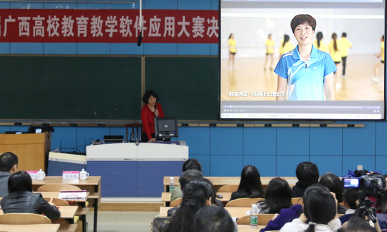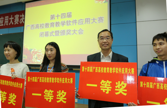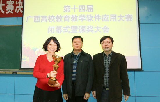 新闻网消息(通讯员 教务处 林宁 摄影 现教中心 黎飞)11月29日至30日,第十四届广西高校教育教学软件应用大赛现场决赛在广西师大隆重举行。我院十三件作品获奖,分别取得一等奖5项,二等奖5项,三等奖3项,优秀奖5项和优秀组织奖1项,是我院在该项赛事获奖总数最多的一年。我院鞠红霞副院长在颁奖仪式上接过了交接杯——2015年第十五届广西高校教育教学软件应用大赛将由我院承办。