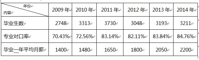 坚持办学和市场双向结合。以市场为导向,确立了“加强我院自身优势专业的基础上,根据市场需求对专业设置进行调整,依照岗位标准设课程”的思路,实现了学院专业设置与企业需求的对接。例如先后新增了工程机械技术服务与营销、软件技术(手机软件方向)、财务管理、工业环保与安全技术等近年来市场需求较高的专业。2014届毕业生率达到92.96%,就业单位类型包括国有企业、私营企业、三资企业和其它企业(党政机关、中等、初等教育单位、医疗卫生单位、其他事业单位、城镇社区和金融单位等),到国有企业就业的有597人,占已就业人数的20%;到私营企业就业的有1970人,占已就业人数的66%;到三资企业就业的有268人,占已就业人数的9%;到其他企业就业的有150人,占已就业人数的5%。
