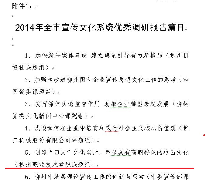新闻网消息(通讯员 宣传部 古志华)柳州市委宣传部近日下发《关于表彰2014年度全市宣传文化系统优秀调研报告、优秀工作案例的通知》,表彰2014年度柳州市宣传思想文化工作调研成果及工作案例,7篇调研报告被评为“优秀调研报告”,我院调研成果《创建“四大”文化名片,彰显具有高职特色的校园文化》(柳州职业技术学院课题组)为其中之一。