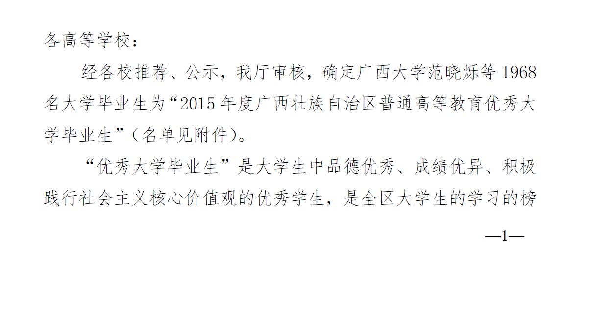 优秀大学生是大学生中品德优秀、成绩优异、积极践行社会主义核心价值观的优秀学生,是全区大学生的学习榜样。自治区教育厅高等学校对优秀大学毕业生评选进行了严格的审查,最终确定1968名大学生为“2015年度广西壮族自治区普通高等教育优秀大学毕业生”。我院获得此项荣誉的35名同学分别是:何秀辉、麦考威、黄永辉、陆阶德、黄园、农志升、张月泽、李少新、蒙碧珊、陆飞霞、韦尤近、蔡蕊蔓、吴婷婷、郑京、卓新银、谭志荣、翁敏、董海涛、韦露、 周志海、李佳棋、戴秋燕、黎芳兰、莫志亮、廖翠英、龚柳华、梁坤芳、莫耀、王善威、韦超、韦丽萍、徐从军、杨涛、张浩、钟声。