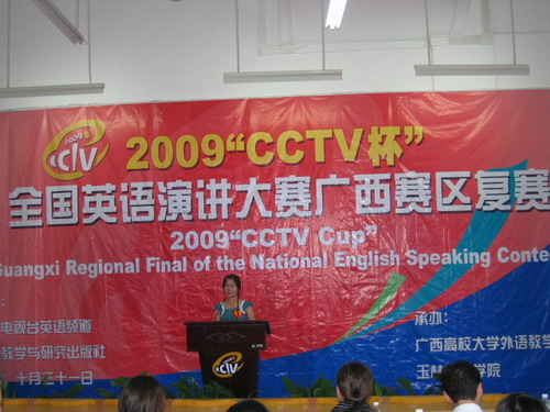 2009年10月31日,第八届“CCTV杯全国大学生英语演讲大赛”(2009 “CCTV Cup” English Speaking Contest)广西赛区复赛在玉林师范学院落下帷幕,我院蔡思思和梁凤丹同学在公共基础部英语教师的指导下沉着自信、努力拼搏,获得了广西赛区优胜奖,我院获得优秀组织奖。