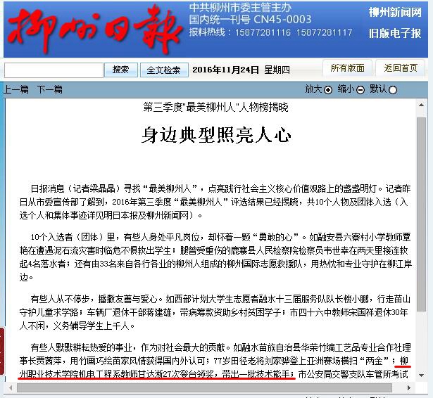 喜讯:我?;绻こ萄г航淌Ω蚀镤廊胙?016年第三季度“最美柳州人”