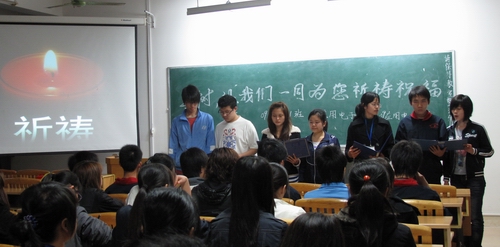 2010年4月22日晚,电子电气工程系09通信技术(1)班,09应用电子技术(1)班和09应用电子技术(2)班三个班在竞择楼707教室一起开展了主题为“玉树 ,让我们一起为您祈祷祝福!”的团日活动。