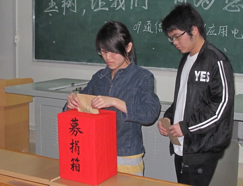 一方有难,八方支援,在观看玉树受灾和救援工作的视频之后,辅导员带头捐款,各班同学代表纷纷走到捐款箱为玉树献出自己的一份爱心。随后,全体人员在写着“玉树加油,中国加油”的横幅上签上自己的名字。辅导员在总结时说,灾难来临时,生命是脆弱的,同时在灾难面前,生命又是坚强的,让我们生命关爱生命,真心守望生命。